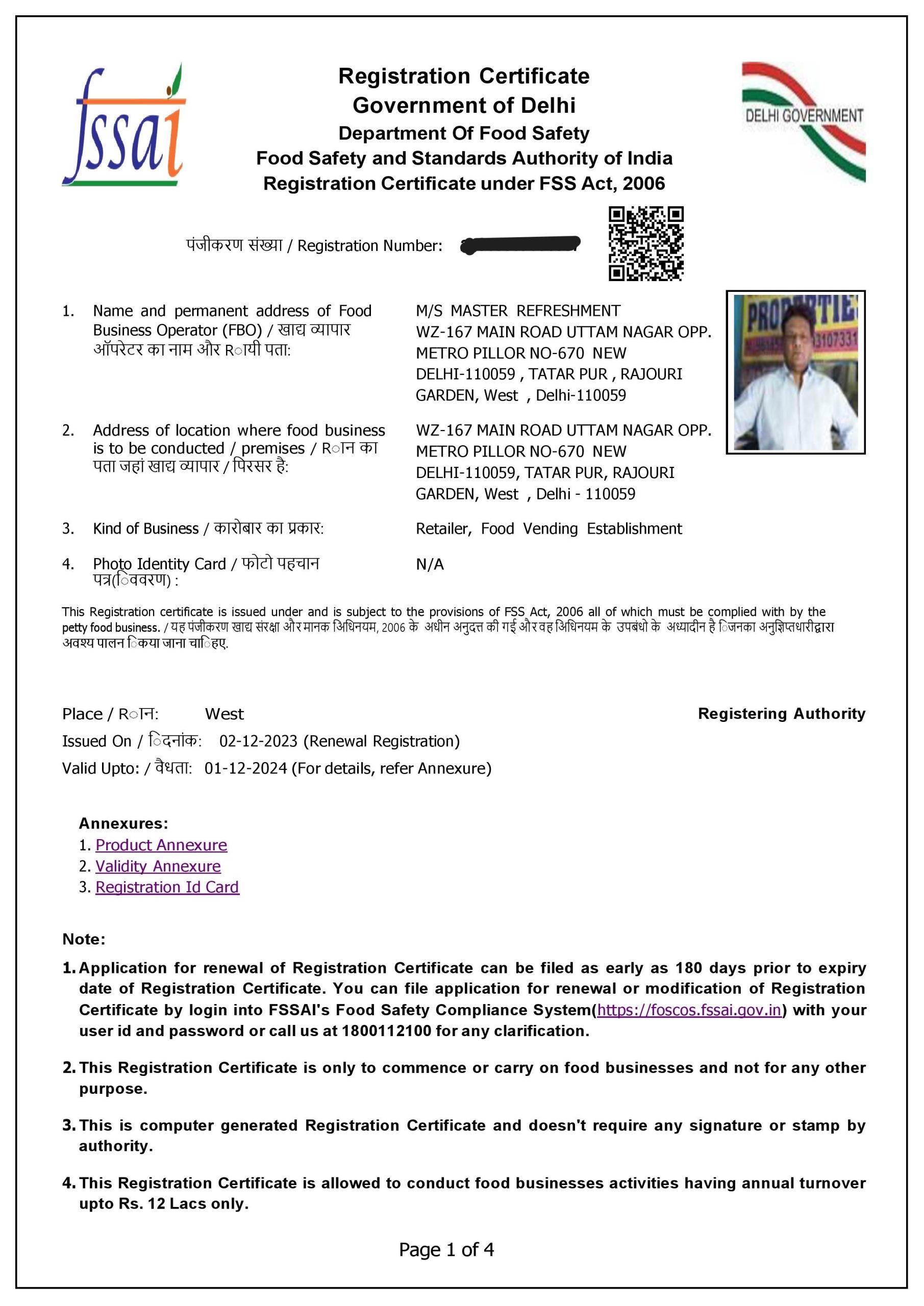 This is a copy of the registration certificate issued at our premises, which is in line with the standards set by the Food Safety and Standards Authority of India (FSSAI). The certificate includes vital information such as the license number, business name and address, type of license, validity period, and other pertinent details. It serves as evidence that our business adheres to the necessary food safety standards and is authorized to engage in food-related operations.